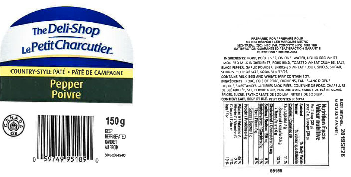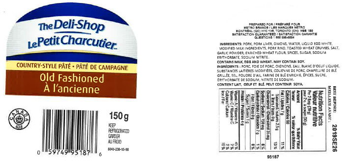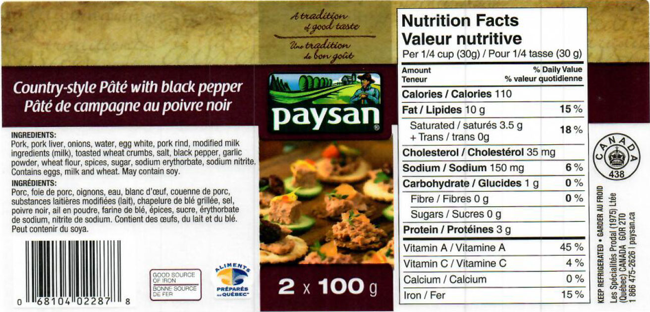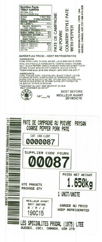 | Les Specialites Prodal (1975) Ltee | Pate de campagne au poivre | Variable | Toutes dates « Meilleur avant » jusqu'au 2019OC18 inclusivement | Variable |