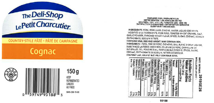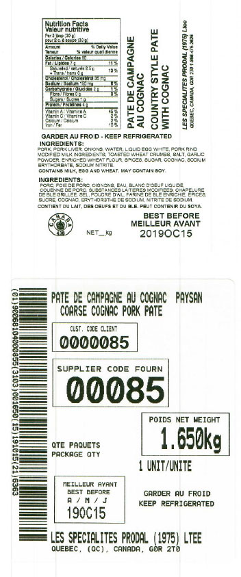 | Les Specialites Prodal (1975) Ltee | Pate de campagne au cognac | Variable | Toutes dates « Meilleur avant » jusqu'au 2019OC18 inclusivement | Variable |