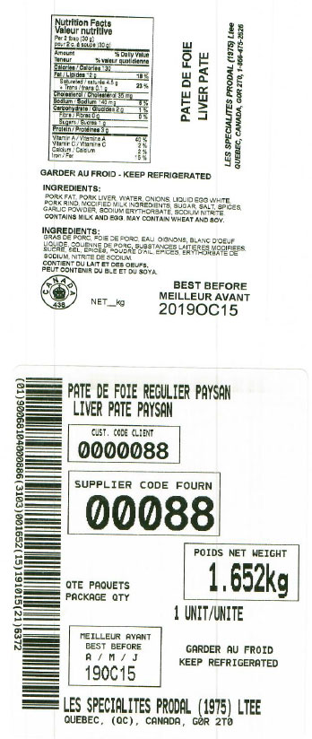 | Les Specialites Prodal (1975) Ltee | Pate de foie | Variable | Toutes dates « Meilleur avant » jusqu'au 2019OC18 inclusivement | Variable |