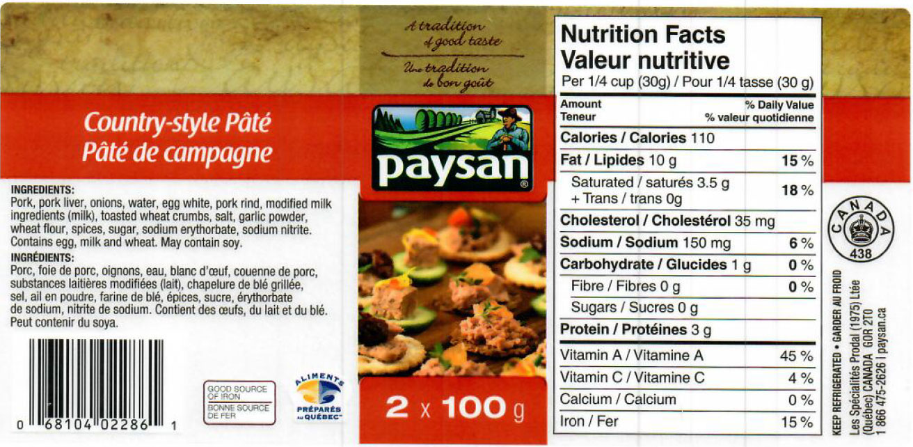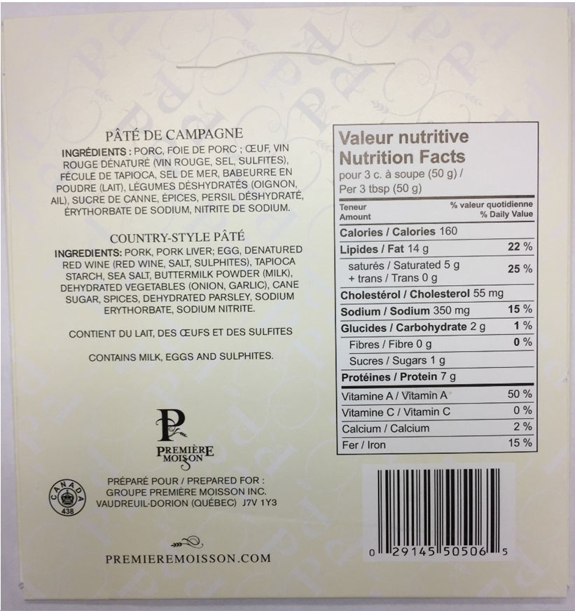 | Les Specialites Prodal (1975) Ltee | Pate de campagne | Variable | Toutes dates « Meilleur avant » jusqu'au 2019OC18 inclusivement | Variable |
