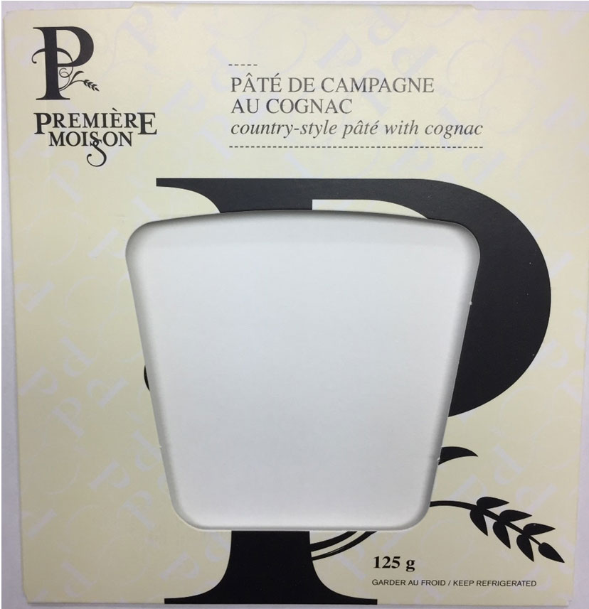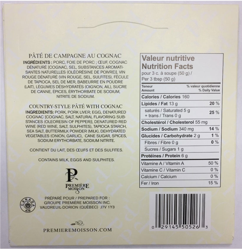 | Première moisson | Pâté de campagne au cognac | 125 g | Toutes dates « Meilleur avant » jusqu'au 2019OC12 inclusivement | 0 29145 50526 3 |