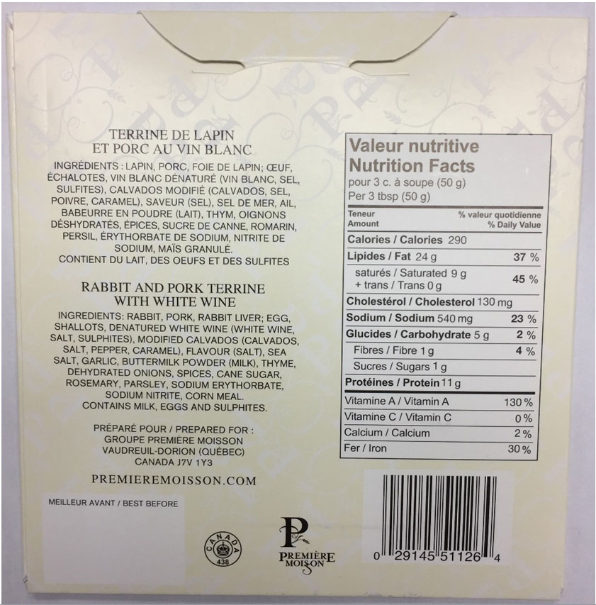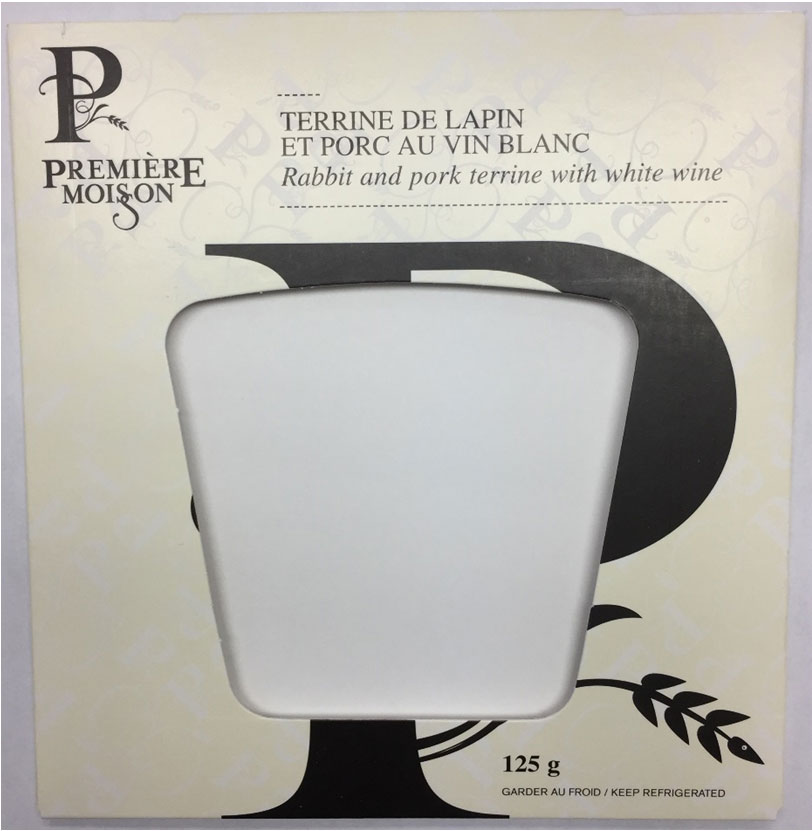 | Première moisson | Terrine de lapin et porc au vin blanc | 125 g | Toutes dates « Meilleur avant » jusqu'au 2019OC12 inclusivement | 0 29145 51126 4 |