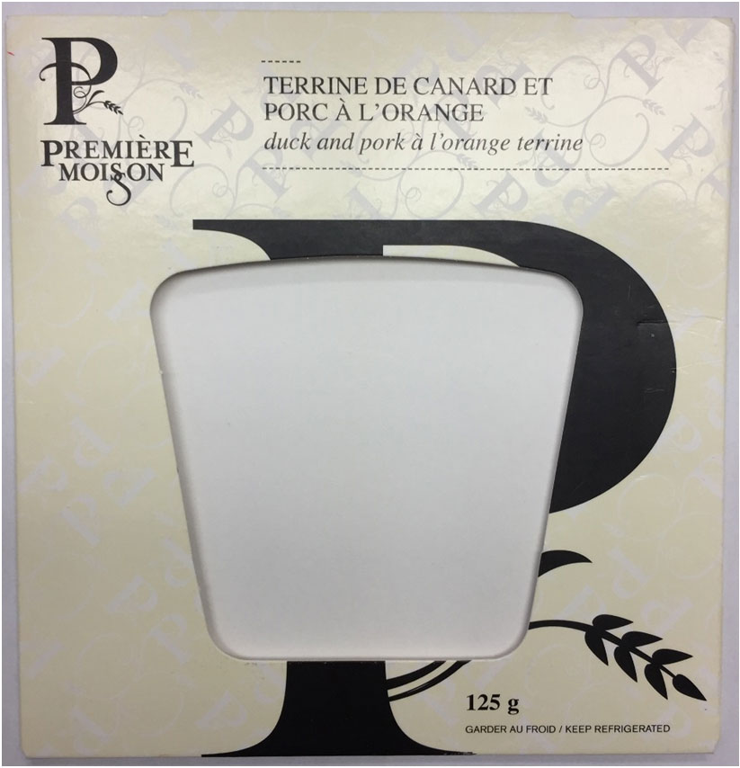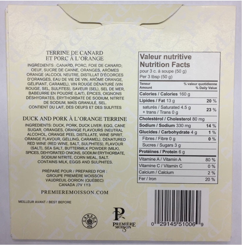 | Première moisson | Terrine de canard et porc à l'orange | 125 g | Toutes dates « Meilleur avant » jusqu'au 2019OC12 inclusivement | 0 29145 51006 9 |