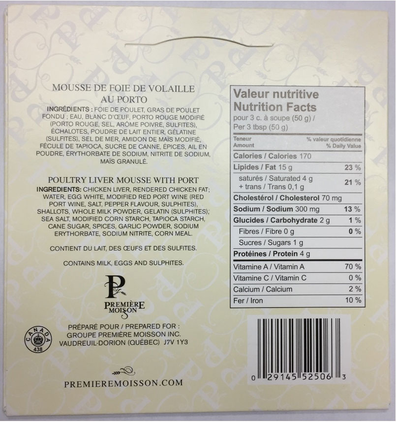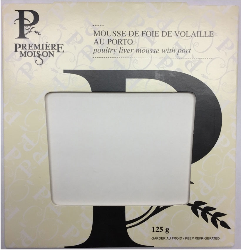 | Première moisson | Mousse de foie de volaille au Porto | 125 g | Toutes dates « Meilleur avant » jusqu'au 2019OC12 inclusivement | 0 29145 52506 3 |