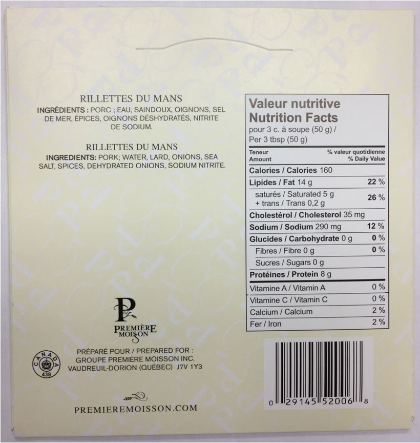 | Première moisson | Rillettes du Mans | 125 g | Toutes dates « Meilleur avant » jusqu'au 2019OC12 inclusivement | 0 29145 52006 8 |