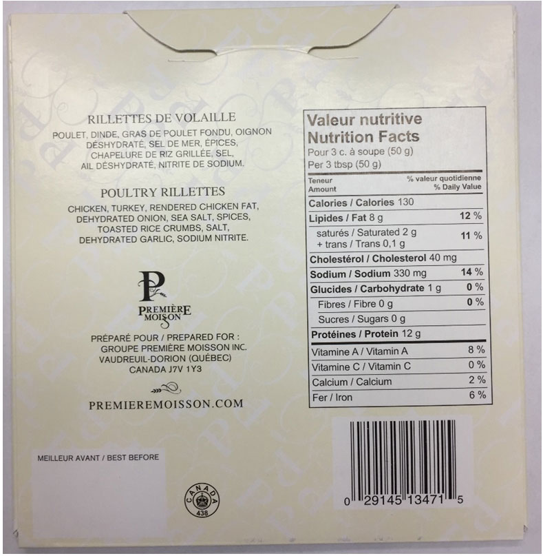 | Première moisson | Rillettes de volaille | 125 g | Toutes dates « Meilleur avant » jusqu'au 2019OC12 inclusivement | 0 29145 13471 5 |