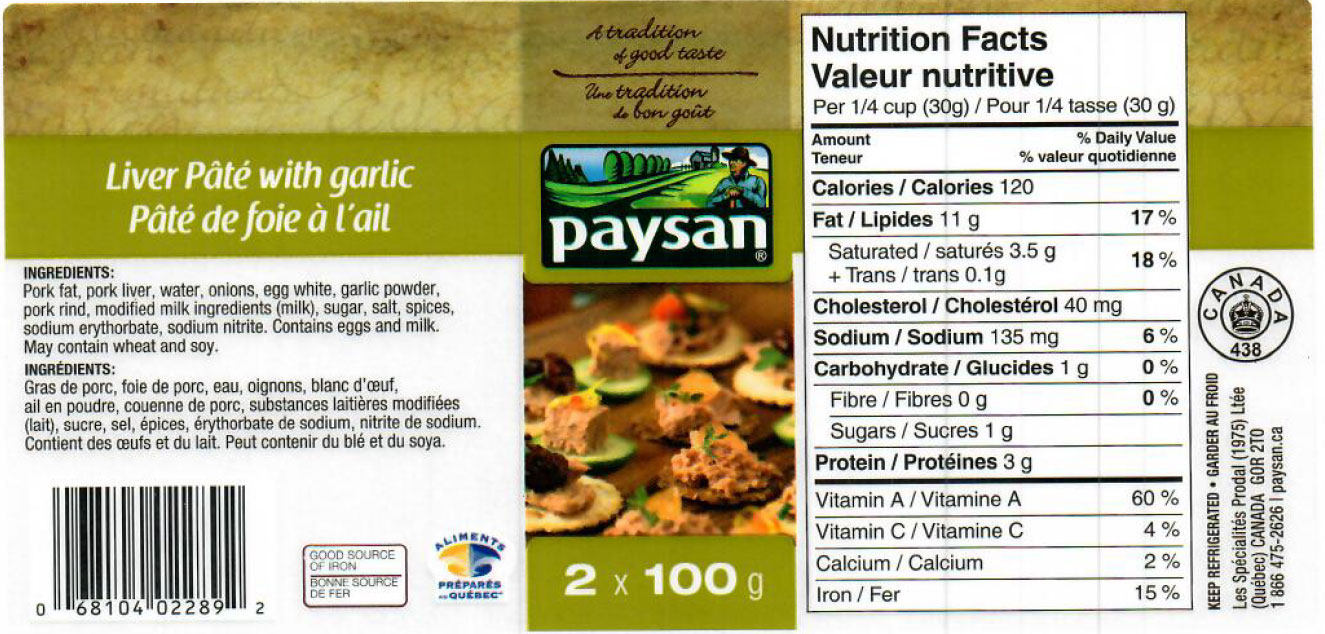 | Paysan | Pâté de foie à l'ail | 2 x 100 g | Toutes dates « Meilleur avant » jusqu'au 2019OC12 inclusivement | 0 68104 02289 2 |