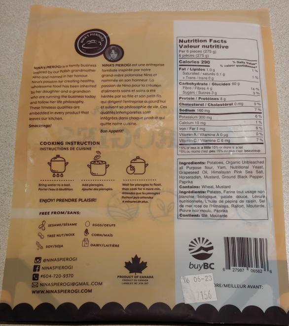 | Nina's Pierogies | Pierogies cheddar végétalien | 450 g | 6 27987 06562 6 | 16 06-23 7156 |