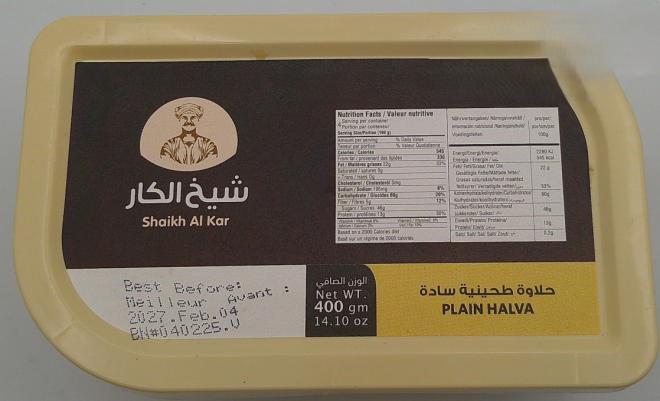 | Shaikh Al Kar | « Plain Halva » | 400 g | 6 253011 500647 | Meilleur Avant : « 2027. Feb.04 » BN#040225.V |