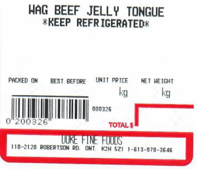 | Duke Fine Foods | « Wag Beef Tongue Jelly » (Servi au comptoir) | Variable | Débutant par 0 200326 | Tous les emballages vendus jusqu’au 6 octobre 2024 inclusivement | Vendu chez : Duke Fine Foods, 2120 Robertson Rd. Unité 110, Nepean, ON |