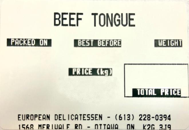 | European Delicatessen* | « Beef Tongue » (Servi au comptoir)* | Variable* | Aucun* | Tous les emballages vendus jusqu’au 3 octobre 2024 inclusivement* | Vendu chez : European Delicatessen, 1568 Merivale Rd., Ottawa, ON* |