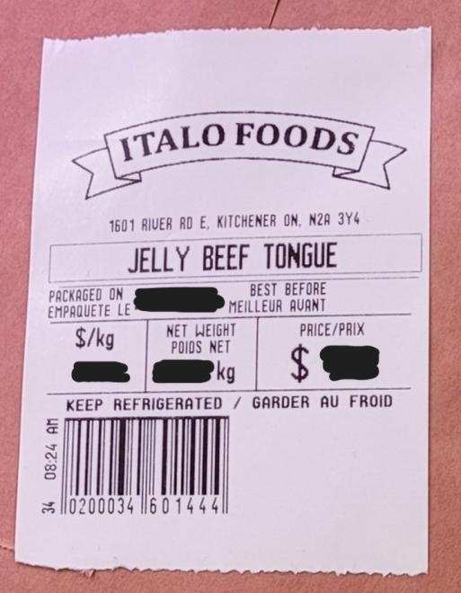 | Italo Foods | « Jelly Beef Tongue » (Servi au comptoir) | Variable | Débutant par 0200034 | Tous les emballages vendus jusqu’au 3 octobre 2024 inclusivement | Vendu chez : Italo Foods, 1601 River Road East, unité 24, Kitchener, ON |