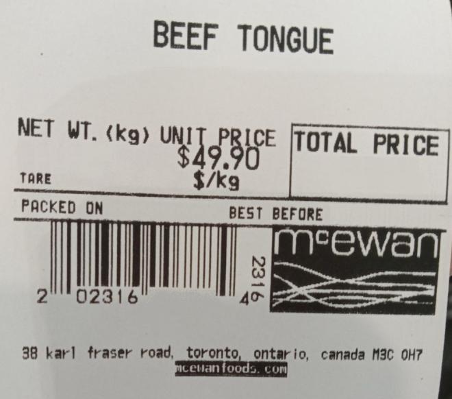 | McEwan | « Beef Tongue » (Servi au comptoir) | Variable | Débutant par 2 02316 | Tous les emballages vendus jusqu’au 4 octobre 2024 inclusivement | Vendu chez : McEwan Fine Foods, 38 Karl Fraser Rd., Toronto, ON |