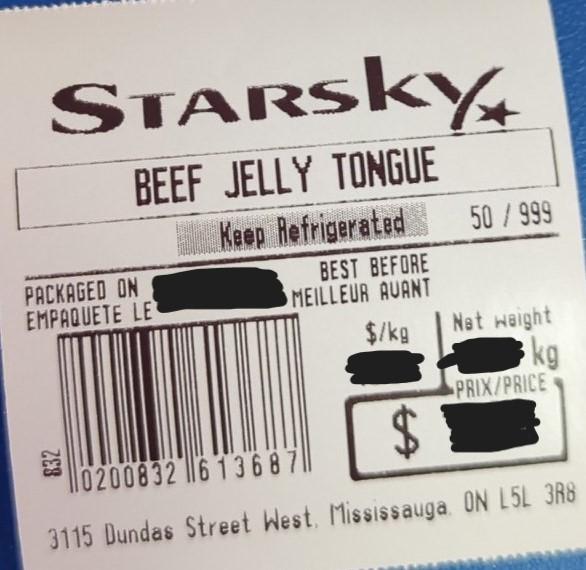 | Starsky | « Beef Jelly Tongue » (Servi au comptoir) | Variable | Débutant par 0200832 | Tous les emballages vendus jusqu’au 4 octobre 2024 inclusivement | Vendu chez : Starsky Fine Foods, 3115 Dundas Street West, Mississauga, ON |