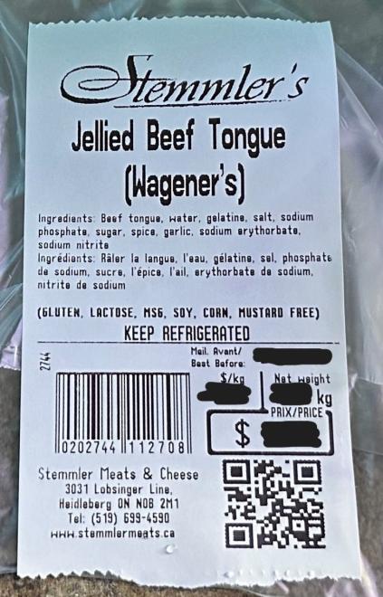 | Stemmler’s | « Jellied Beef Tongue (Wagener's) » (Servi au comptoir) | Variable | Débutant par 0202744 | Tous les emballages vendus jusqu’au 4 octobre 2024 inclusivement | Vendu chez : Stemmler’s Meats & Cheese Retail Store, 3031 Lobsinger Line, Heidleberg, ON |