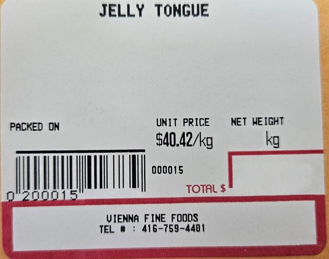 | Vienna Fine Foods | « Jelly Tongue » (Servi au comptoir) | Variable | Débutant par 0 200015 | Tous les emballages vendus jusqu’au 5 octobre 2024 inclusivement | Vendu chez : Vienna Fine Foods, 1050 Birchmount Rd., Scarborough, ON |