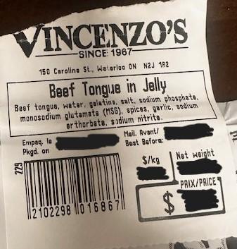 | Vincenzo's | « Beef Tongue in Jelly » (Servi au comptoir) | Variable | Débutant par 2102298 | Tous les emballages vendus jusqu’au 2 octobre 2024 inclusivement | Vendu chez : Vincenzo's, 150 Caroline Street South, Waterloo, ON |