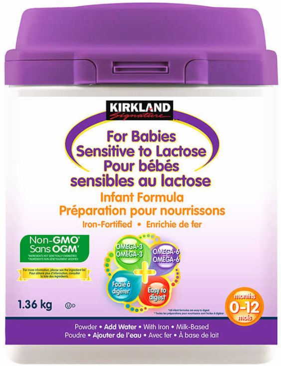 | Kirkland Signature | Préparation pour nourrissons pour bébés sensibles au lactose sans OGM | 1.36 kg | 0 96619 26926 6 | EXP 2020 NO 05 T05DVBV |