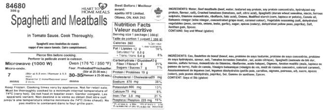 | Heart to Home Meals | Spaghetti avec boulettes de viande | 356 g | Aucun | 23 DE 19 | Œufs, Lait |