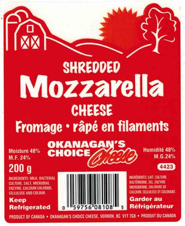 | Okanagan's Choice Cheese | Mozzarella Fromage râpé en filaments | 200 g | « Meilleur avant » 15JA20 | 0 59756 08108 5 | |