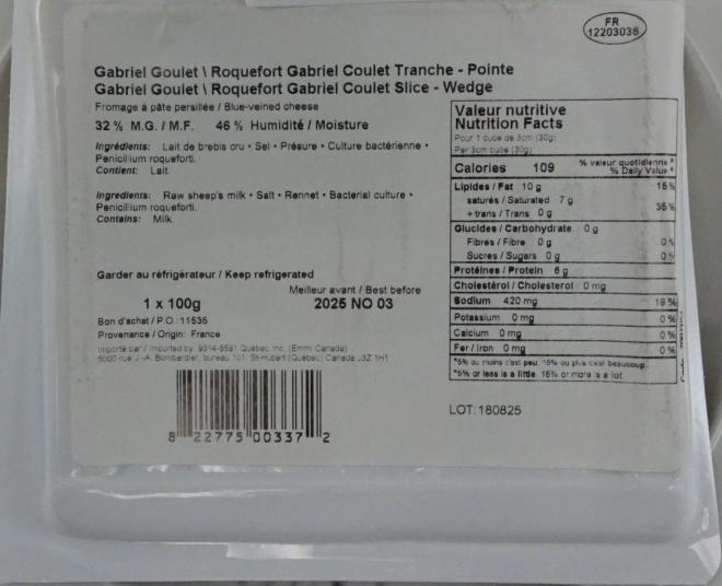 | Maison Gabriel Coulet | Roquefort La Cave - Tranche - Pointe | 100 g | 8 22775 00337 2 | Lot : 180825 Meilleur avant : 2025 NO 03 |