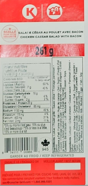 | Circle K / Couche Tard | Salade César au Poulet avec Bacon | 261 g | 8 74111 00966 1 | Meilleur Avant : 22-OC-12 22-OC-13 22-OC-14 |