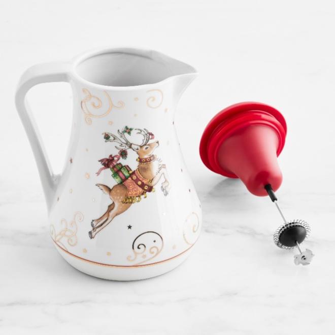 Le récipient à chocolat chaud est blanc avec un couvercle rouge. Il est fabriqué en céramique et porte un renne sur la face avant. En outre, il comprend un mousseur à lait portable à piles. Le code de date 5/22 est affiché sur le dessous du pot.