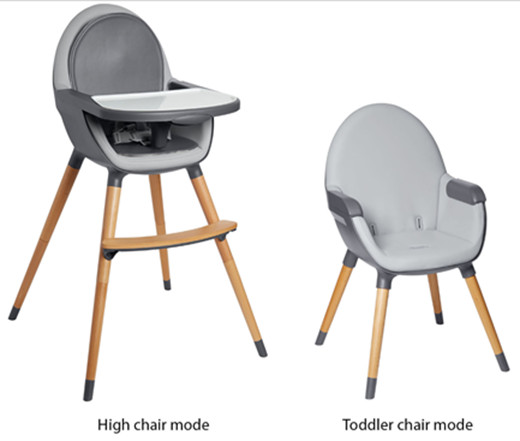Le présent rappel vise les chaises hautes convertibles Tuo de couleur gris anthracite, qui peuvent être converties en chaise pour tout-petits. Seules les chaises hautes portant les numéros de modèle 304200 et 304200-CN et l’un des codes dateurs suivants : HH102016, HH11/2016, HH3/2017 et HH4/2017, qui figurent à l'arrière du produit, sont rappelées. Les chaises hautes sont munies d'un coussin de siège réversible, d'un plateau amovible, d'un harnais à cinq points et d'un appuie-pieds et de pattes en hêtre. Les autres chaises ne sont pas visées.