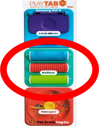 Le présent rappel vise la tuile à rouleaux pour le tableau d’activités modulaire PlayTab. La tuile à rouleaux a été vendue individuellement ou dans un ensemble de 3 tuiles sous le nom de « PlayTab Sensory Set 3 » (ensemble sensoriel 3 PlayTab) placé dans le présentoir PlayTab. La tuile comporte un rouleau bleu, un rouleau rouge et un rouleau vert. Les numéros de modèle concernés sont les suivants : tuile à rouleaux – FA488-17; ensemble sensoriel 3 – FA488-5.